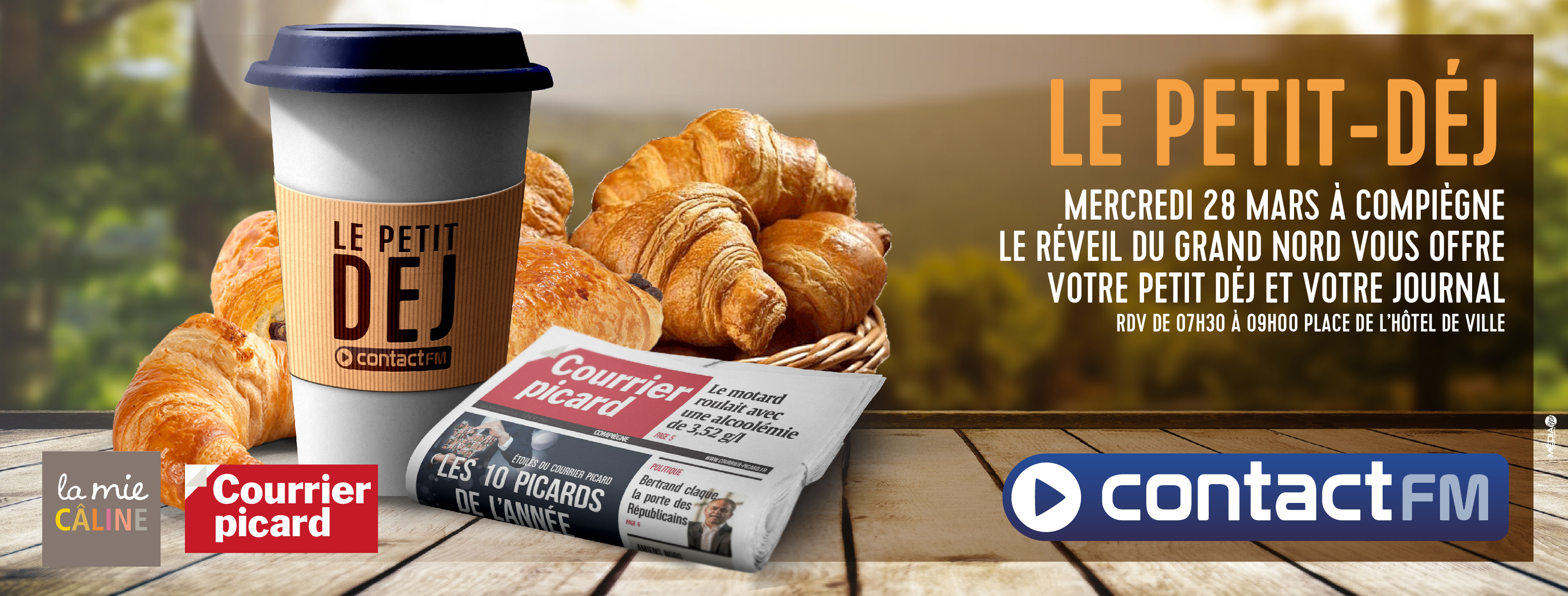 RDV le mercedi 28 mars de 07h30 à 09h00 dans Compiegne pour déguster une bonne vienoiserie La Mie Caline et récupérer votre journal Le Courrier Picard.